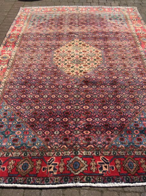 Large red & blue ground Persian carpet with traditional senadash design 310cm by 210cm