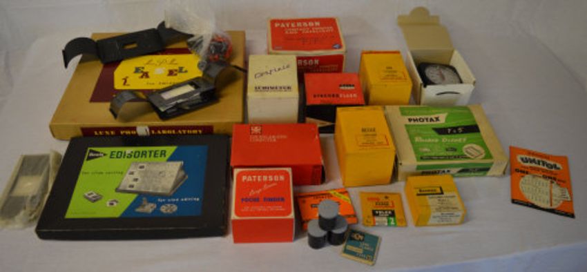 Photography accessories including enlarging meters, safelights, rocker dishes, focus finder, Smiths timer etc