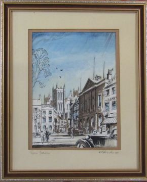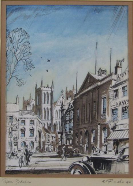 Framed colour wash pen and ink drawing of Ripon Yorkshire signed ** Rooke 1941 49 cm x 60 cm (size including frame)