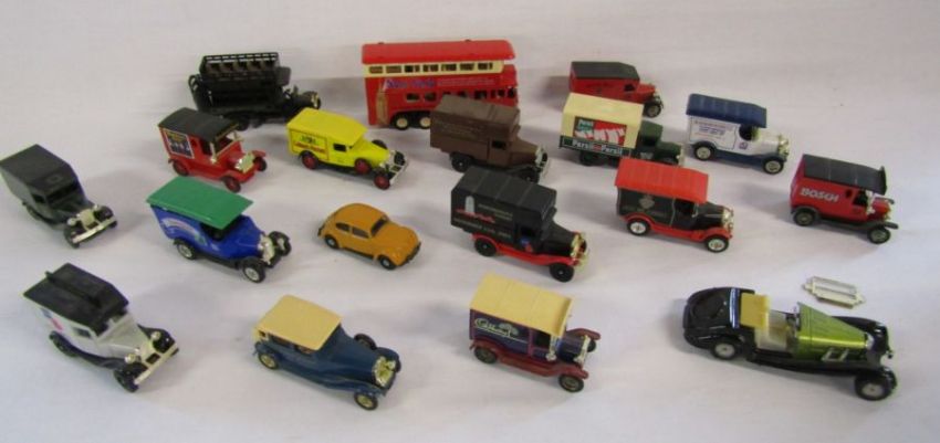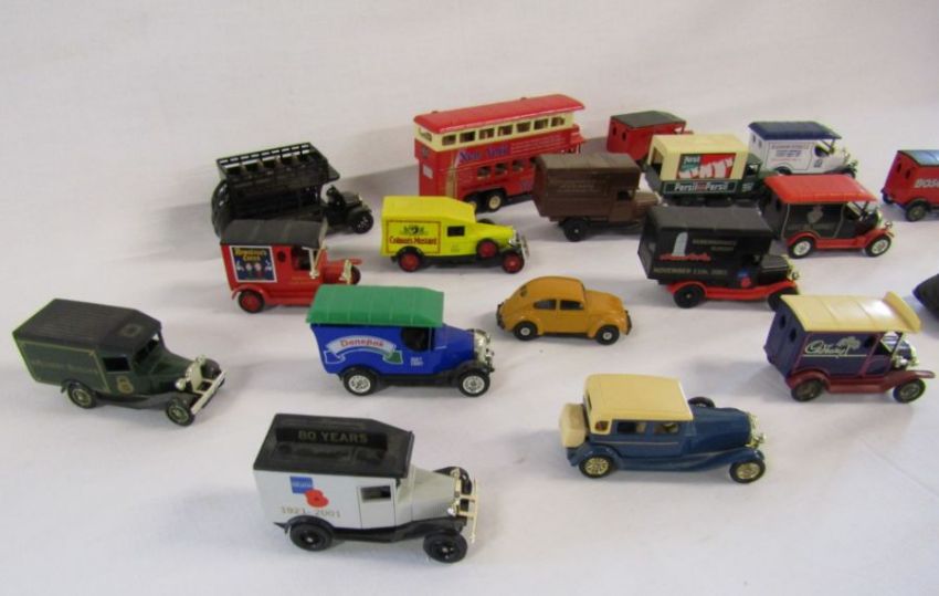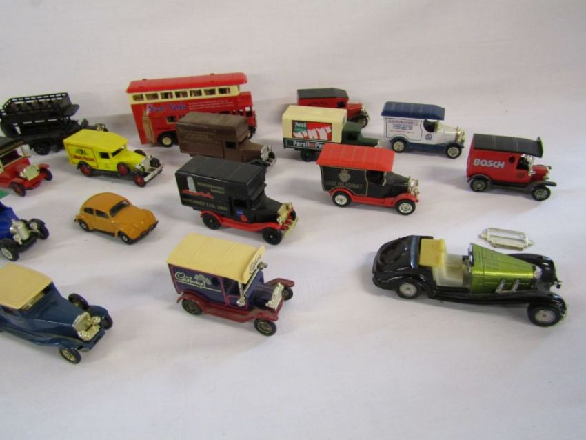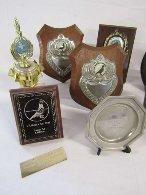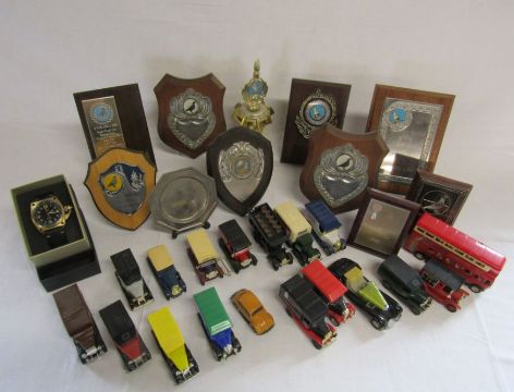 Collection of toy cars to include Days Gone By and Oxford diecast, a SHIELD gents pascal watch and a selection of pigeon racing trophies