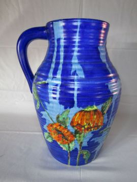 Clarice Cliff Bizarre single handled lotus jug in Marigold pattern approx. Ht. 30.5cm
