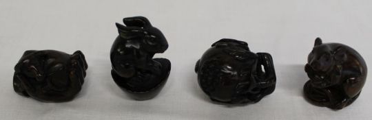 4 Japanese hardwood signed netsuke: - rat, rabbit, ox and fruit, all with signed mother of pearl circular panels