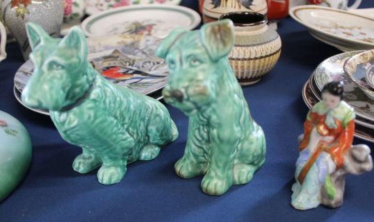 Selection of decorative ceramics including green Sylvac terrier & Scottie Dog (chip to ear), Moorcroft style vase, Hard Rock Cafe glass etc.