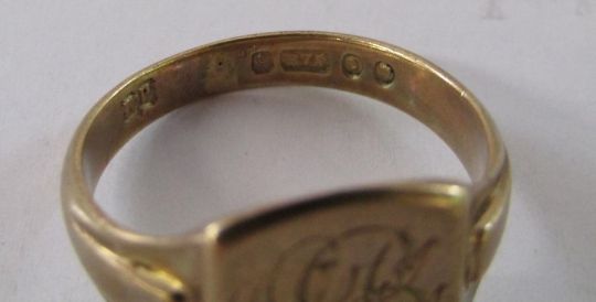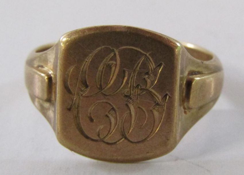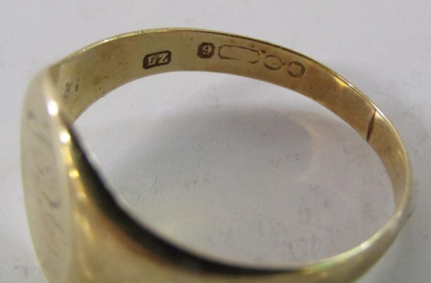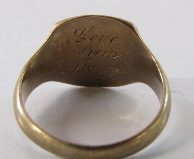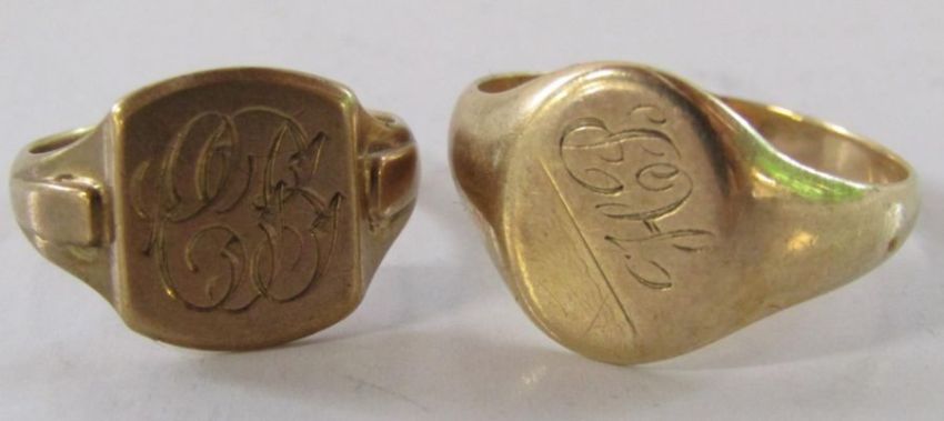 2 x 9ct gold signet rings one with engraving 'Love from Mary' ring size M/N and EH ring size X/Y - total weight - 8.5g
