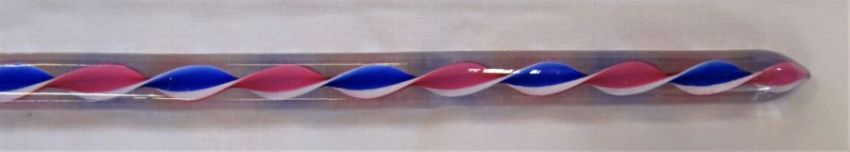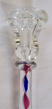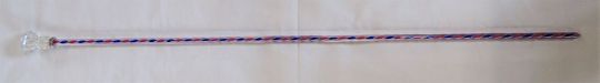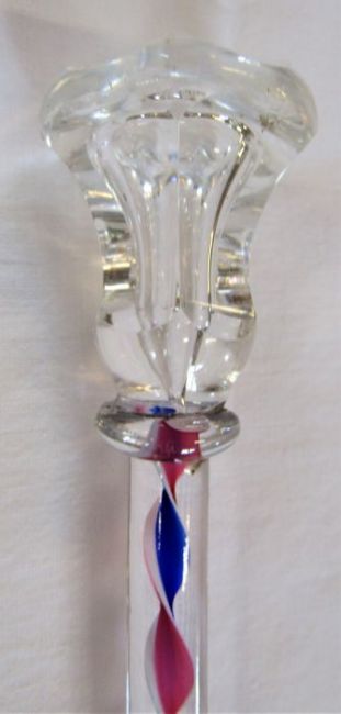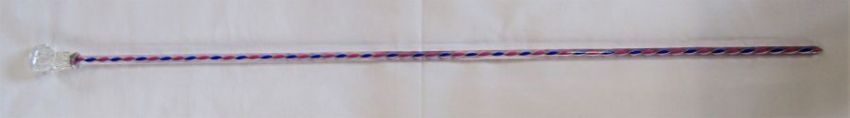 Clear glass plain cane or walking stick with a cut clear knopped finial and containing red, blue and white spiral