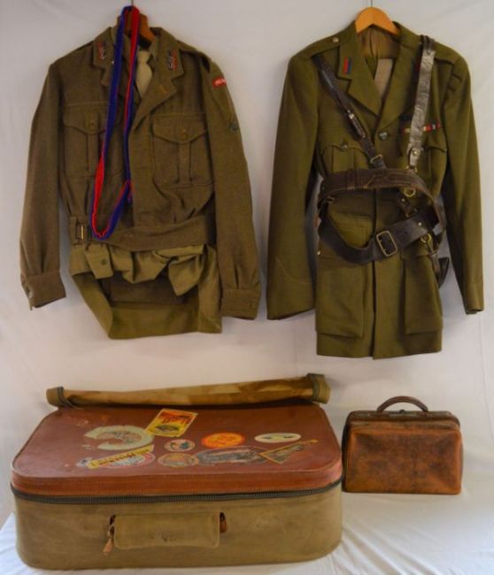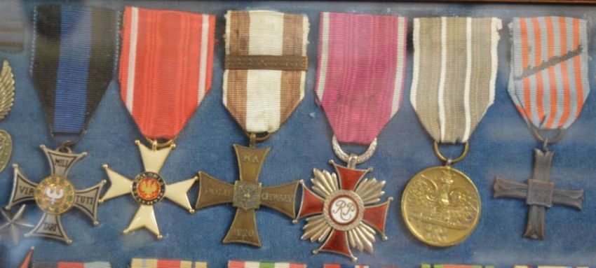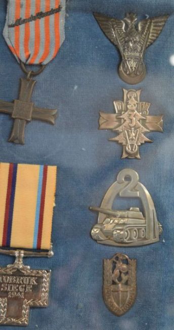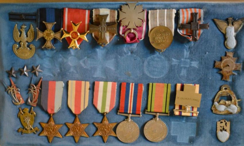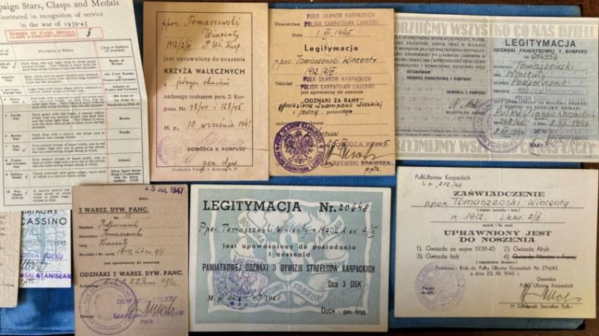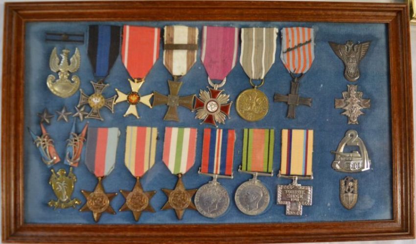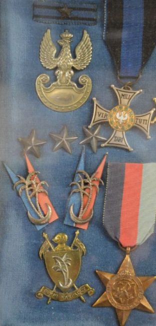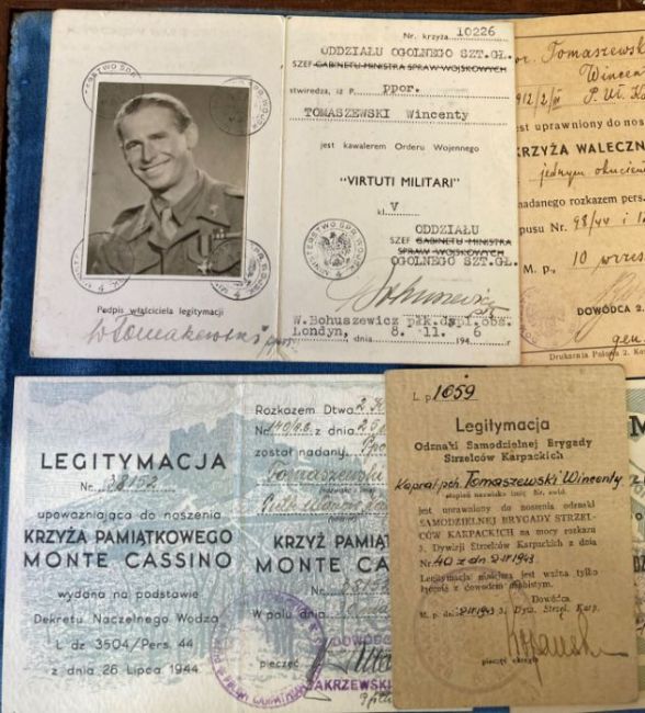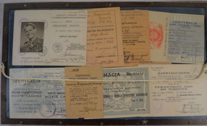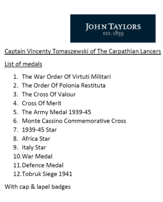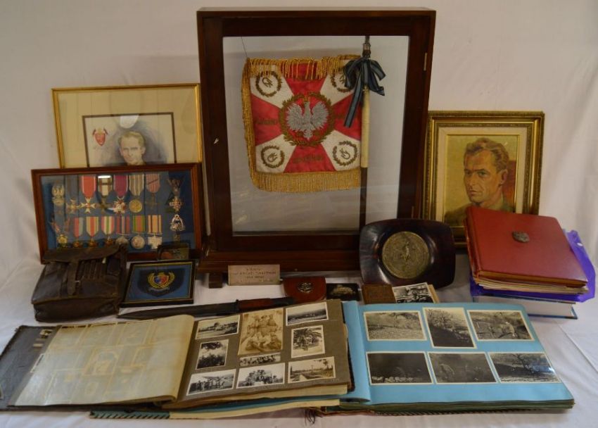 Unique collection of the late Captain Vicenty (Wincenty) Tomaszewski of the Polish Carpathian Lancers who fought through World War II. The collection includes his cased medals (including Virtuti Militari), two uniforms, bayonet, cased small regimental flag and two photograph albums & other documents relating to campaigns in the war (including the battle of Monte Cassino) along with two portraits of the captain, etc