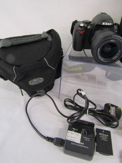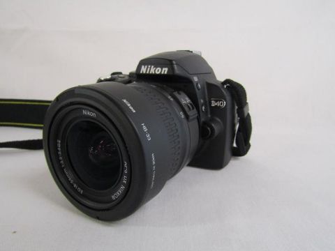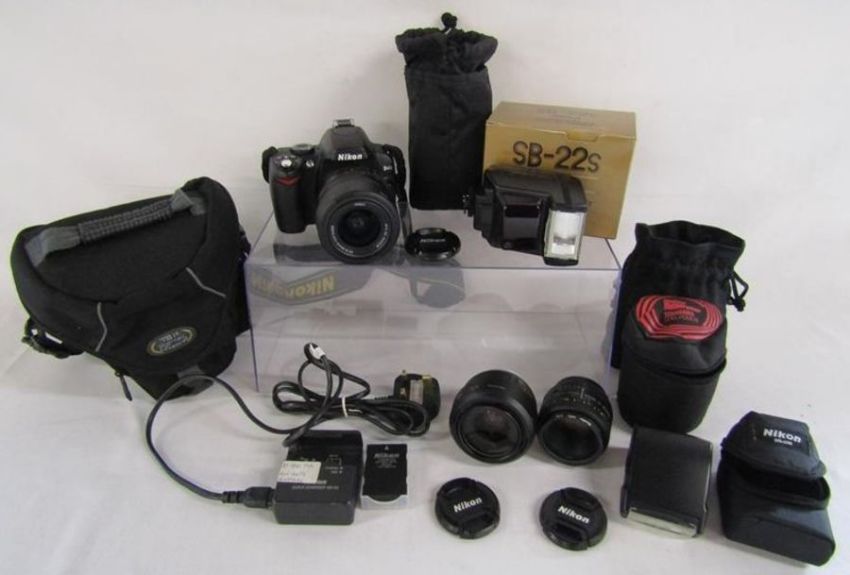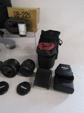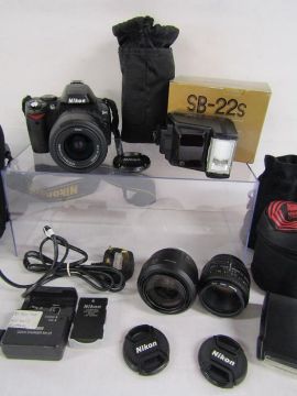 Nikon D40 digital camera with charger, Nikon DX AF-S Nikkor 35mm lens, Nikkor 50mm lens and 18-55mm lens, SS-400 flash, SB-22s flash,