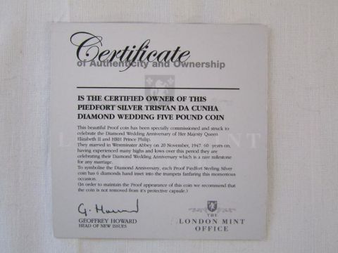 Cased Piedfort silver Tristan Da Cunha Diamond Wedding five pound coin - sterling silver set with 6 diamonds