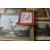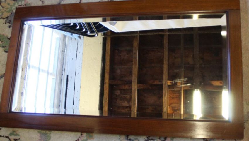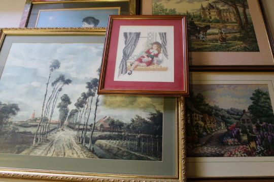 Pair of framed needlepoint scenes and one other, 2 framed prints & mahogany framed mirror 53cm x 96cm