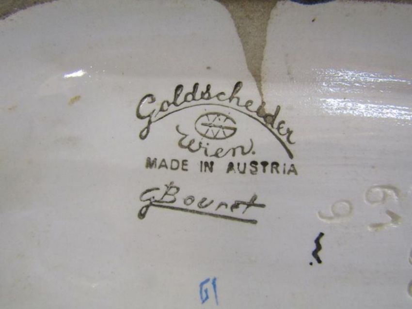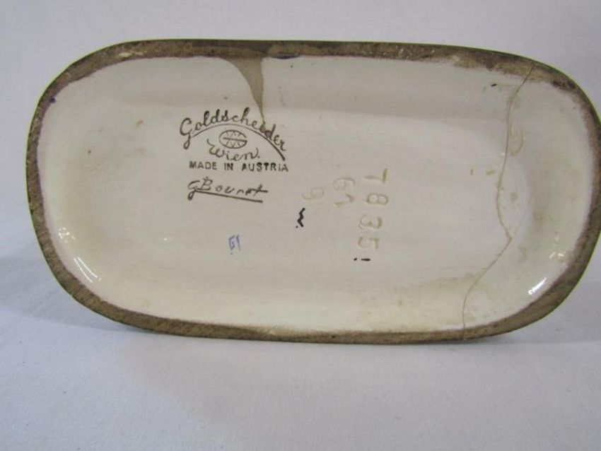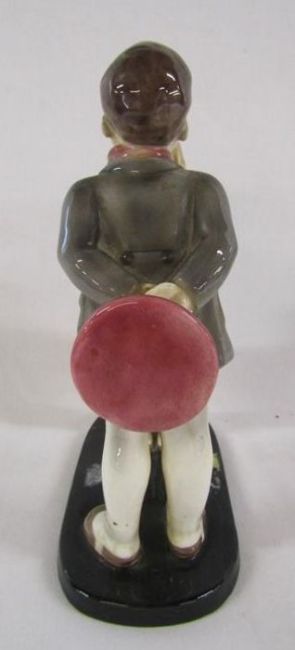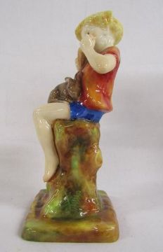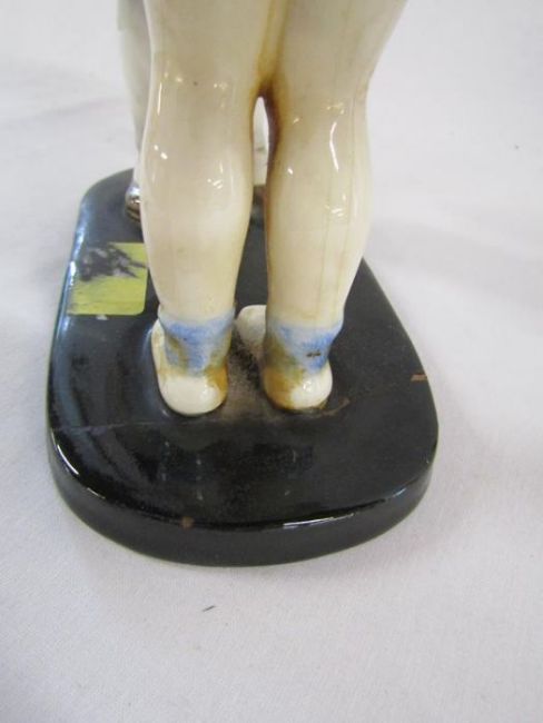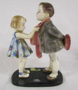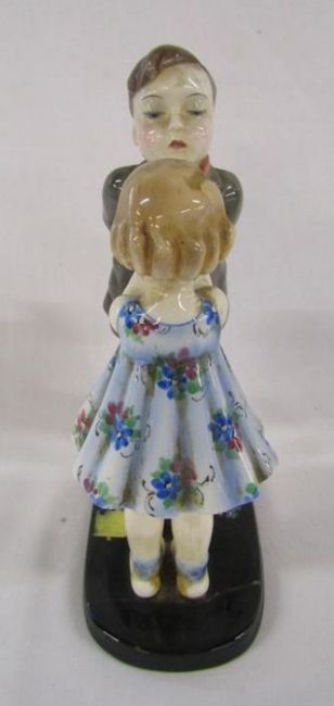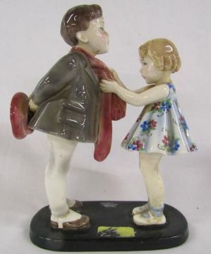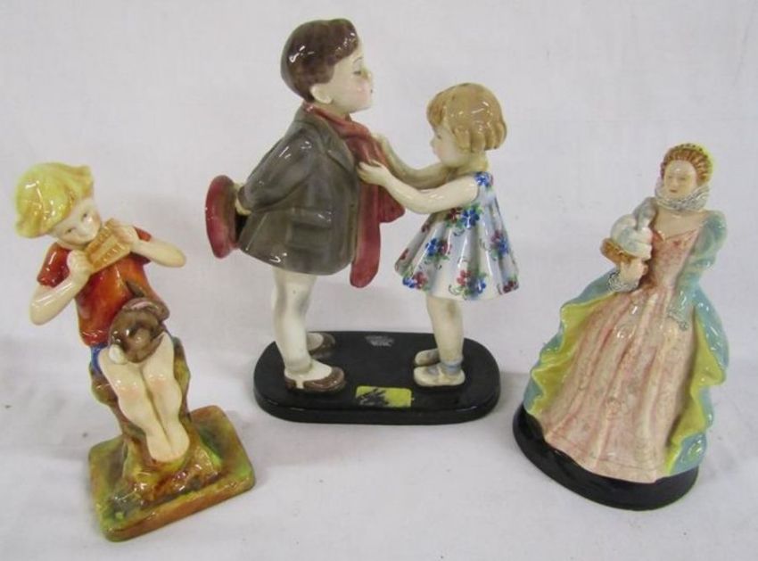 Goldscheider Austria, G Bouret #7835 boy and girl figures (some repair to base), Goldscheider Myott & Son Staffordshire 'Queen Elizabeth' figurine and Royal Worcester 'Peter Pan' modelled by F Gertner 3011/2