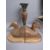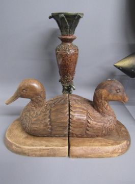 Collection of items includes African shield painted canvas, wooden home items, wooden figures, candlesticks etc
