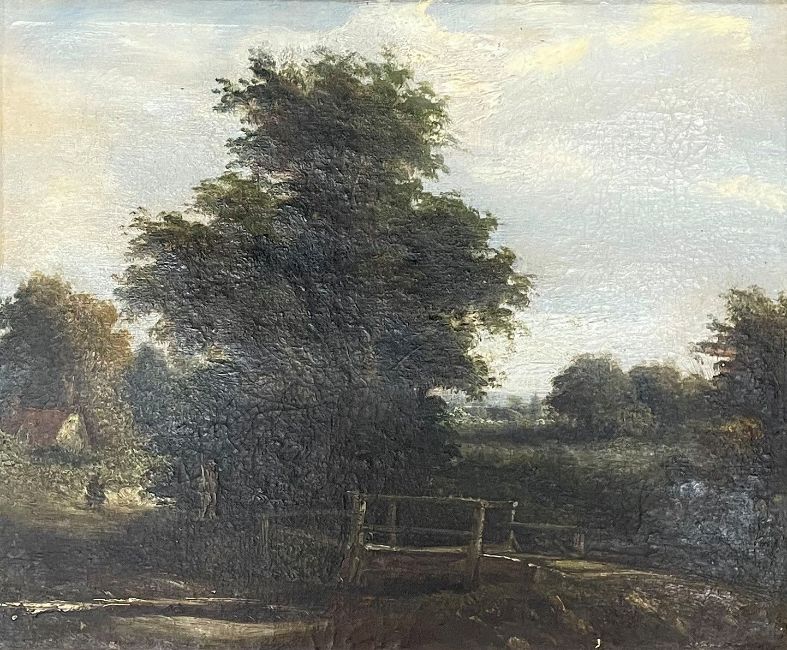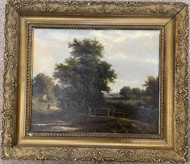 19th century oil on canvas landscape with a bridge in the foreground.  Frame size 58cm by 50cm