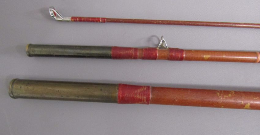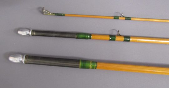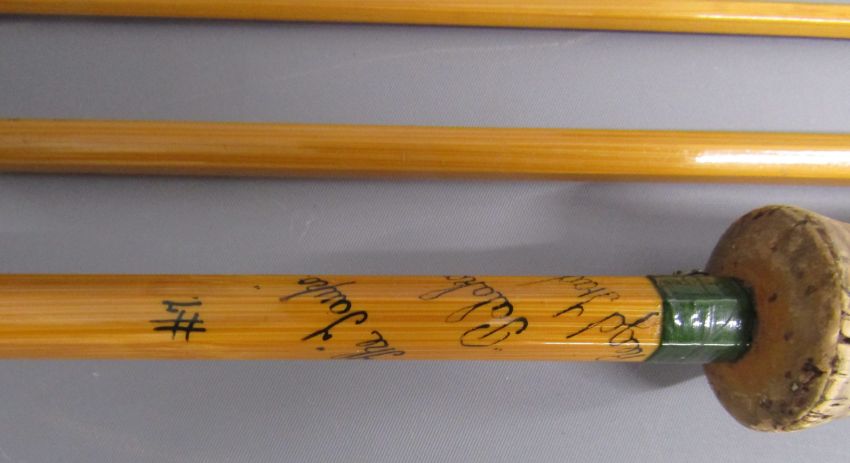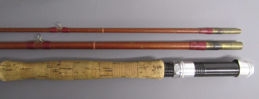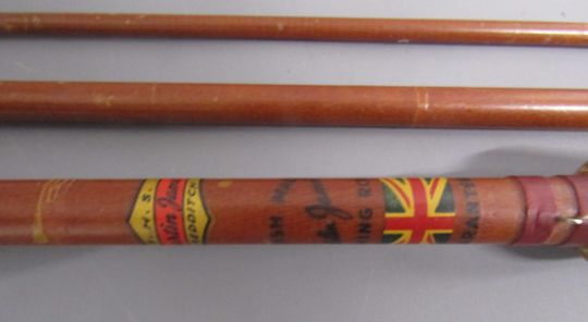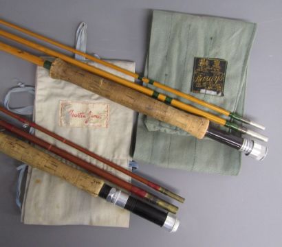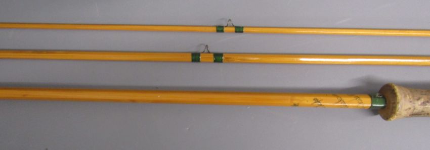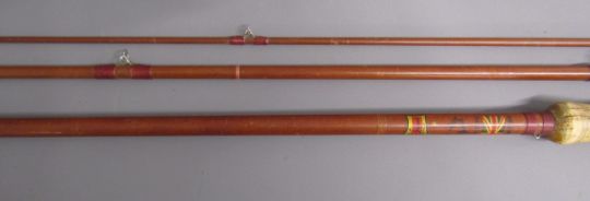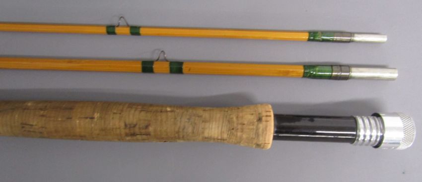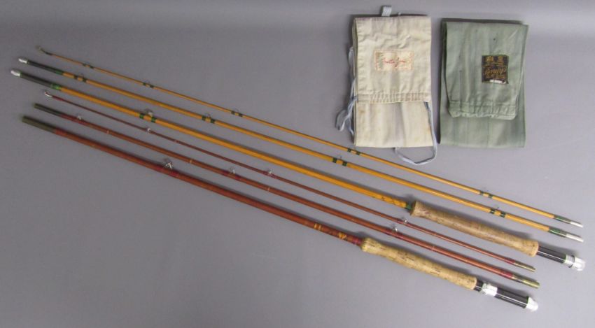 2 x 3 piece fishing rods - Martin James 9ft fibre glass fly fishing rod 'FHS Martin James, Redditch British Made fishing Rod Guaranteed' & Hardy's 10ft split cane fly fishing rod ' #7 The Taupo' 'Palakona' Registered Trademark H41355C marked to butt - both with original sleeves