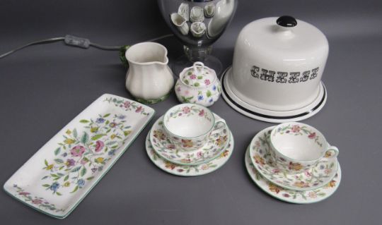Minton Haddon Hall pair of trios and sandwich plate, Barleigh cheese dome, silvered lamp etc