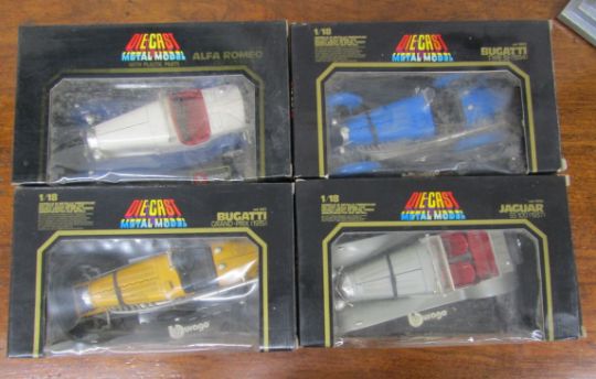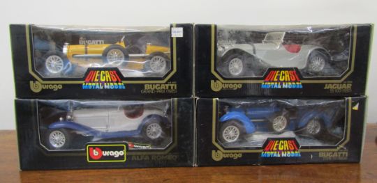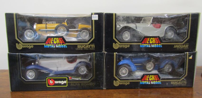 4 boxed Burago cars 3012 Bugatti Grand-Prix (1935) - 3008 Alfa Romeo 2300 Spider (1932) - 3005 Bugatti type 59 (1934) - 3006 SS 100 (1937)