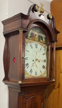Early 19th century longcase clock by James Johnson of Linlithgow with 8 day movement in a flame mahogany case with quarter column corners & swan neck pediment with painted dial with a depiction representing the 4 continents Ht 224cm W 49cm D 24cm