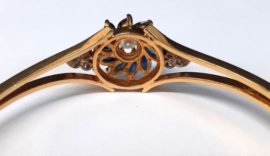 18ct yellow gold hinged bangle set with central brilliant cut diamond approx. 0.50ct (colour F, clarity VVS1) surrounded by 10 marquise cut sapphires, total approx. 1.20ct, with 3 brilliant cut diamonds on each shoulder, total approx. 0.89ct, stamped 750, gross weight 21.21g (valued for insurance NRV £6750)