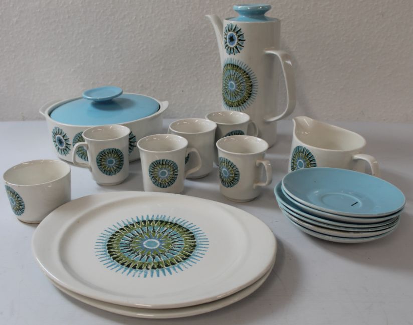 Meakin part dinner service to include 2 cake plates, sugar bowl, milk jug, coffee pot, 5 tea cups, 6 saucers & a tureen