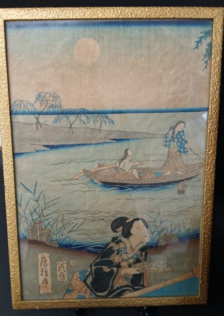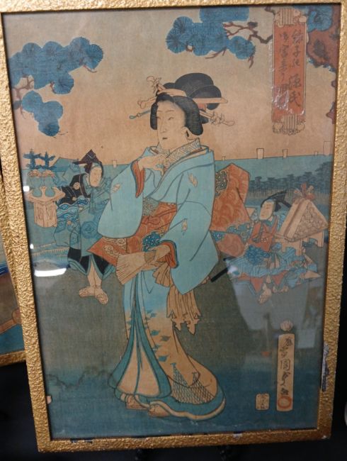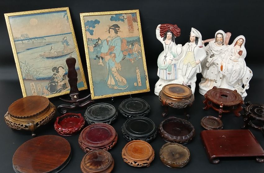 Selection of Chinese carved hardwood stands, two Staffordshire flat back figures & pair of framed Japanese prints