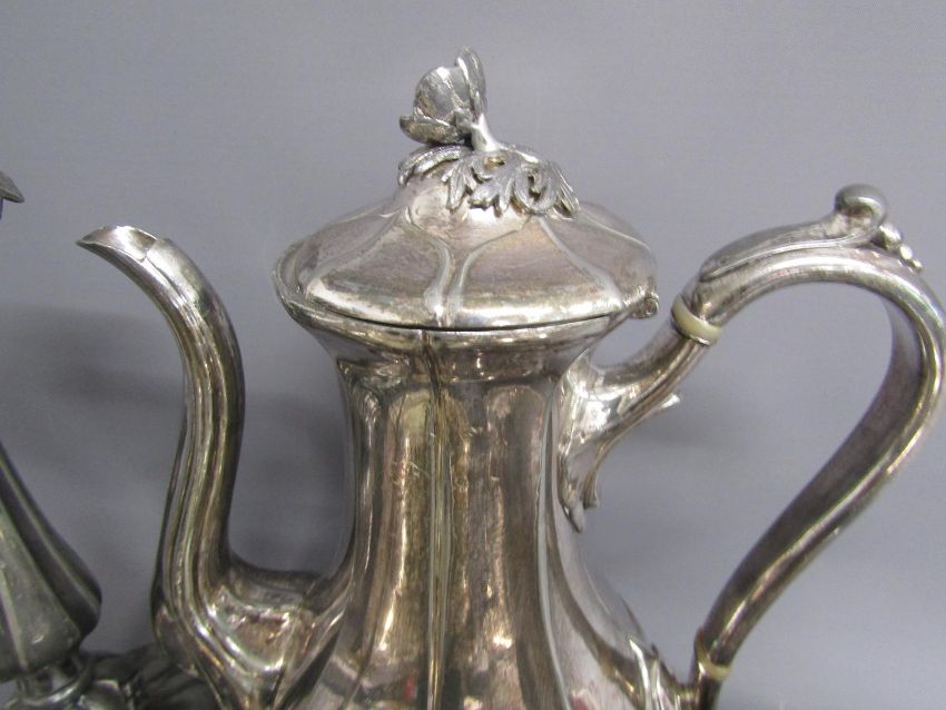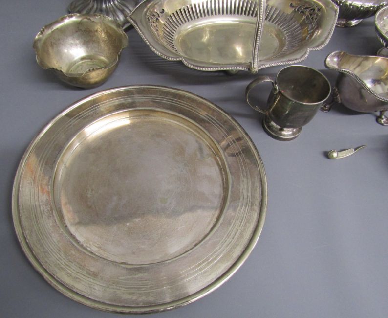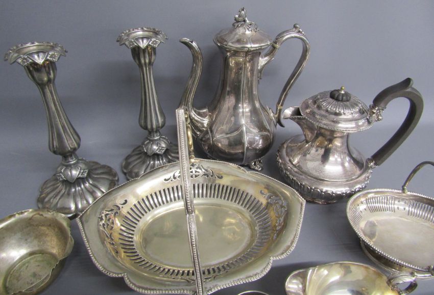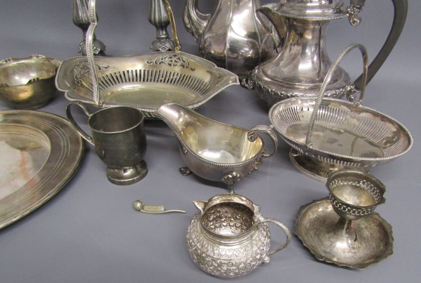 Silver plate teapot, sauce boat, footed basket, bowl, egg cup, cup, James Dixon and sons teapot & candlesticks etc