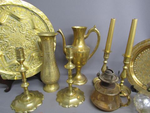 Brass ware includes plates, wall plates, vase, candlesticks etc also 2 glass oil lamps