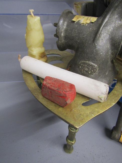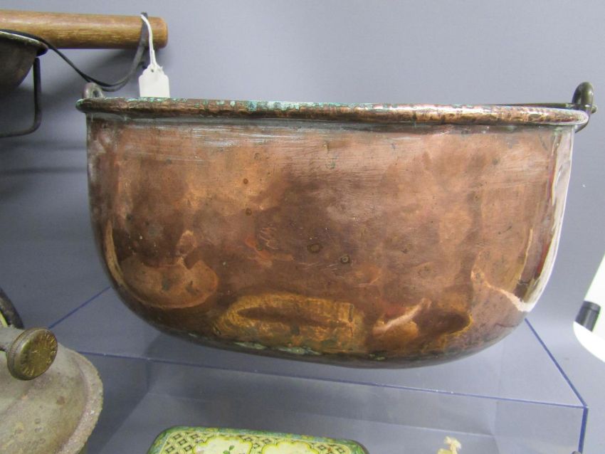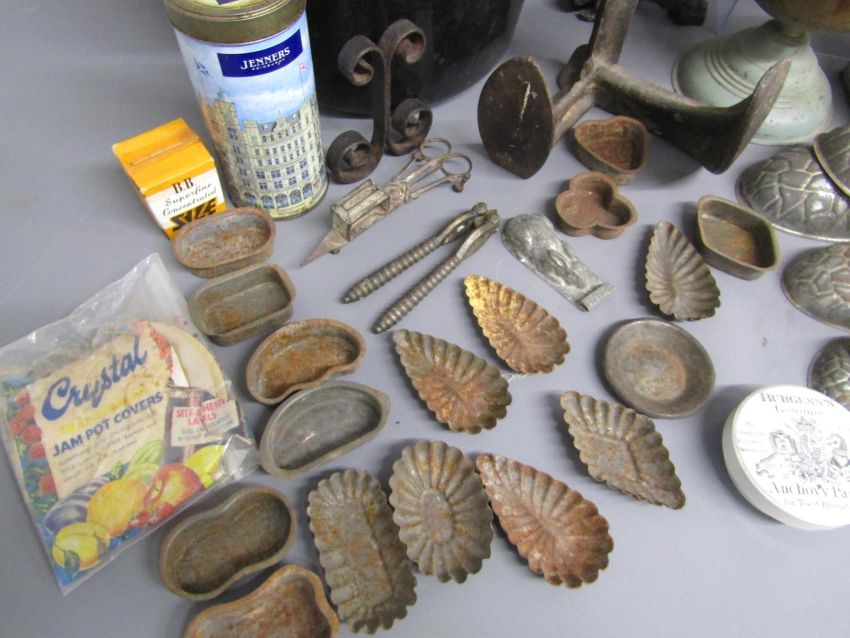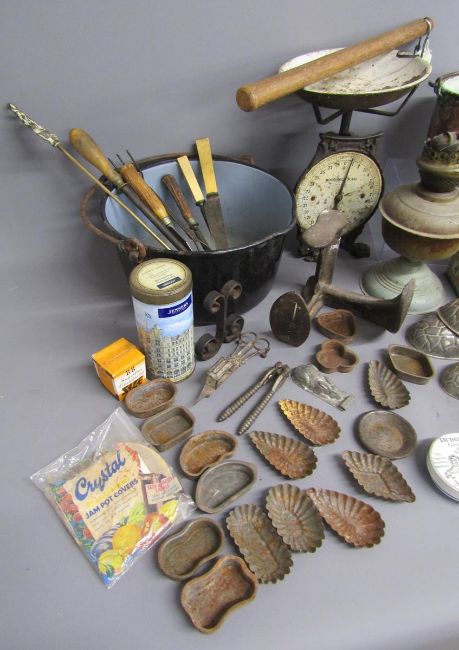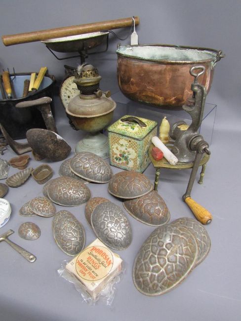 French copper cooking pot, enamelled cooking pot, chocolate egg moulds, shoe last, sealing wax, etc
