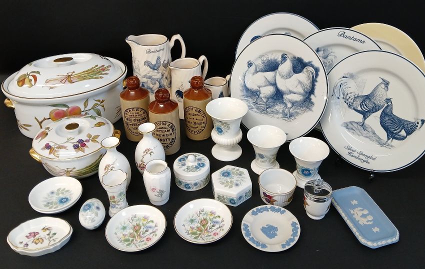 Royal Worcester Evesham casserole dish, smaller casserole dish, ramekin & coddler, selection of Wedgwood Swallow & Cornflower, 4 pieces of Aynsley Wild Tudor, selection of Norfolk China kitchen ware & 3 stoneware bottles