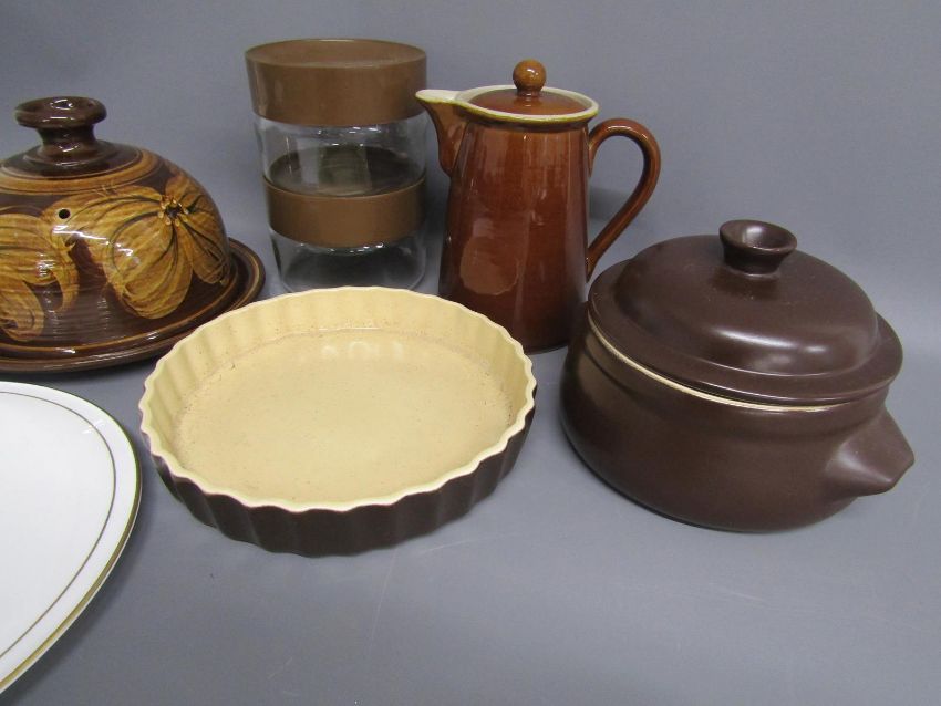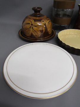 Royal Worcester 'Contessa' cake plate - pottery cheese dome - pair of glass canisters - stew pot - water pot and flan dish