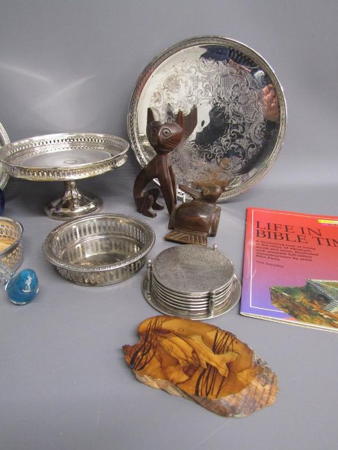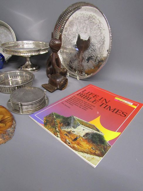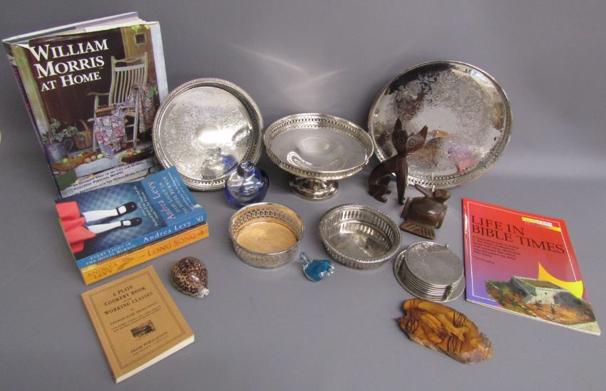 Silver plate includes tazza, coasters, trays also wooden and glass ornaments, books etc