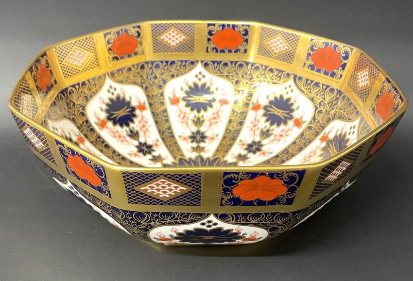 Large Royal Crown Derby Imari pattern 1128 octagonal bowl, there is a light scratch to the back stamp possibly indicating second quality. Dia 24cm Ht 9.5cm