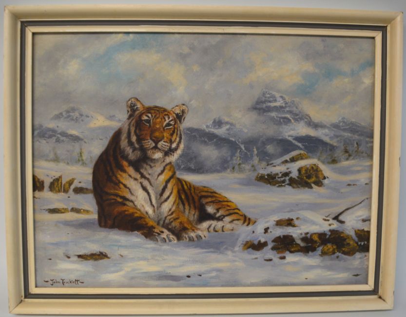 John Trickett (B. 1953) oil on canvas depicting reclining Siberian tiger 67cm x 52cm