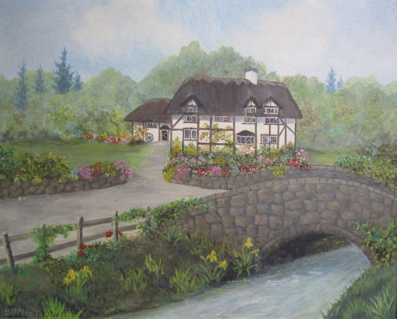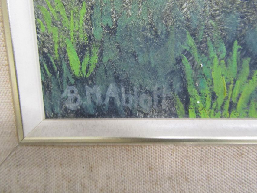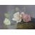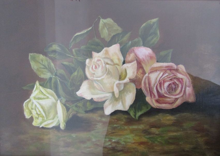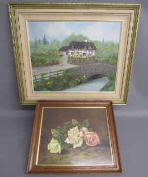 Framed oil on board thatched cottage on a country lane signed BM Ablott 66cm x 56cm & roses, no obvious signature - approx. 44cm x 36cm