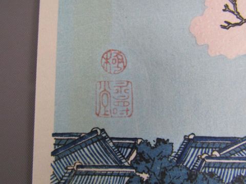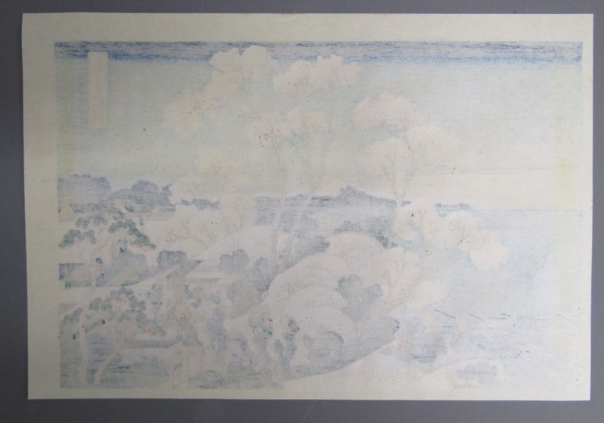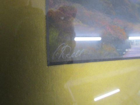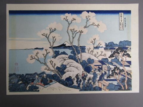 Framed woodblock print after Katsushika Hokusai - Mount Fuji with Cherry Blossoms & framed watercolour signed C Dell with mountainous landscape and river in foreground