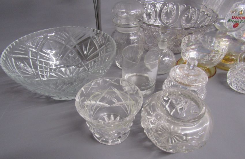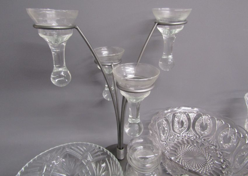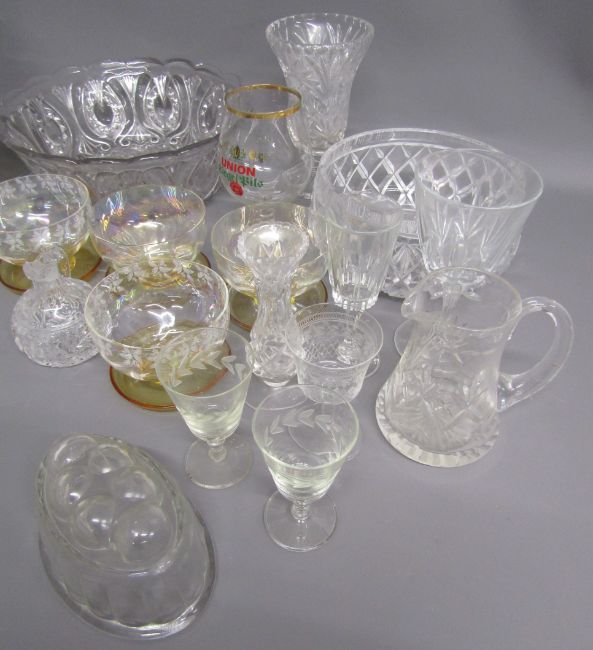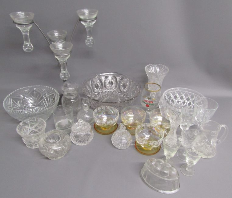 Collection of glassware includes grapefruit dishes, fruit bowls, candle holders, jugs, glasses, jelly mould etc