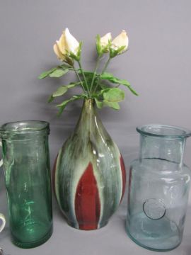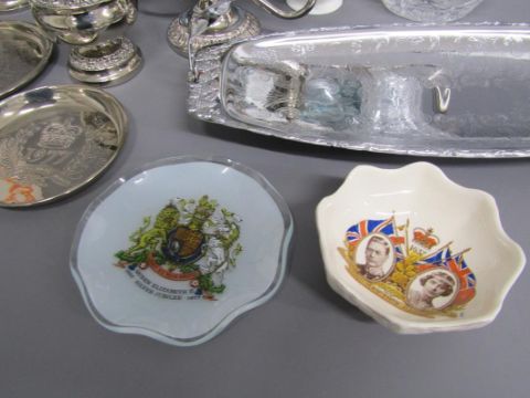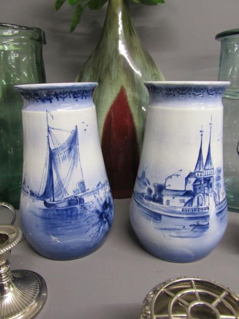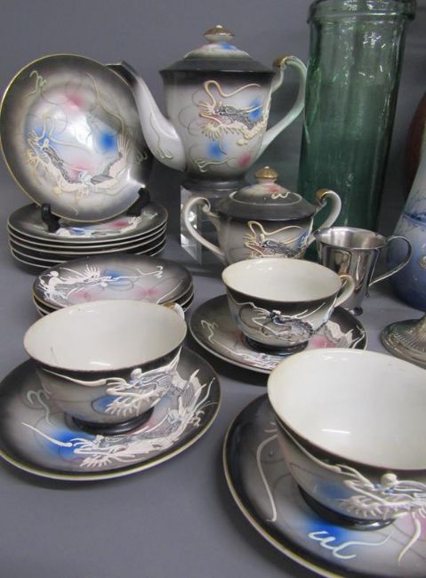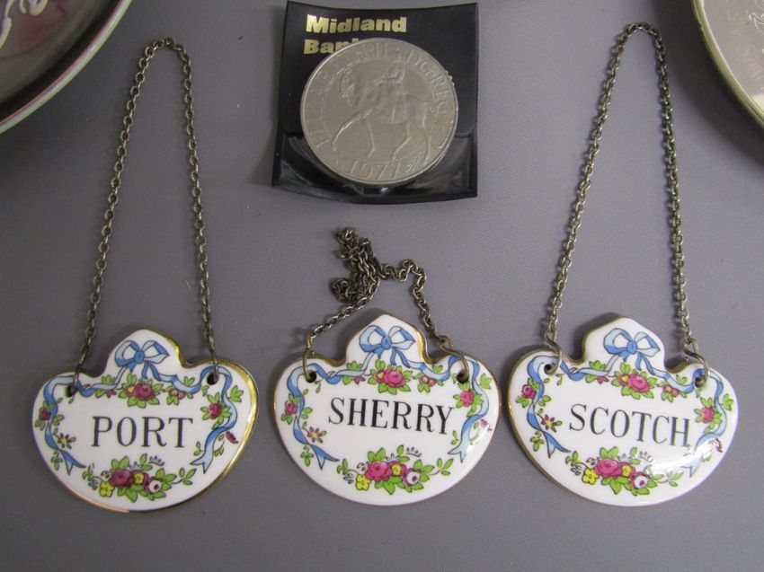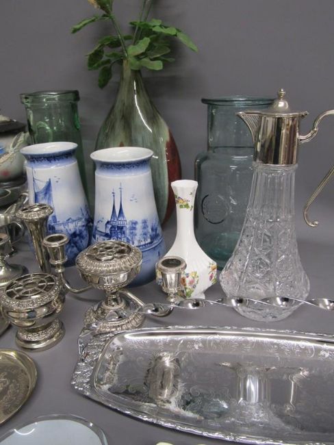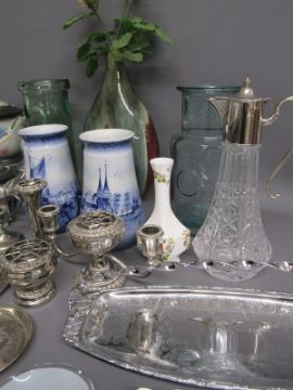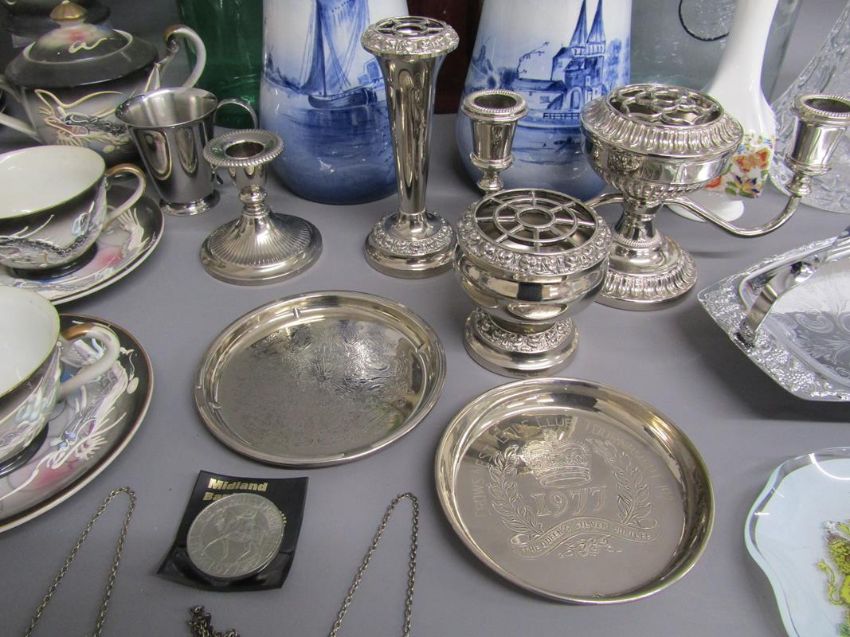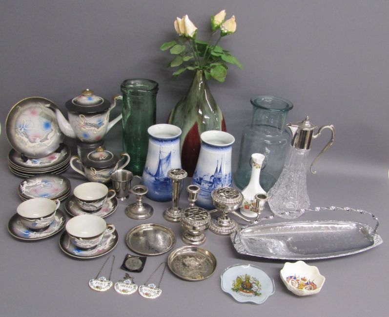 Collection of items includes Crown Staffordshire bottle labels, commemorative coin, silver plate, Kutani 'Dragon ware' part tea set, Aynsley bud vase, large vase with shell roses, Delft vases, claret jug etc