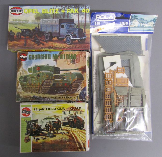 Airfix kits - Opel Blitz + Pak 40 -Churchill MK VII Tank & 25 pdr field gun + quad series 1 also Pola H0 railway building