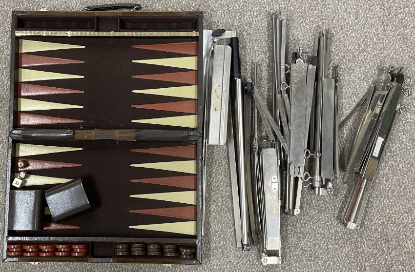 Cased backgammon set & 5 folding sheet music stands