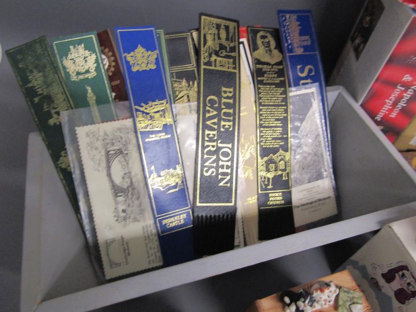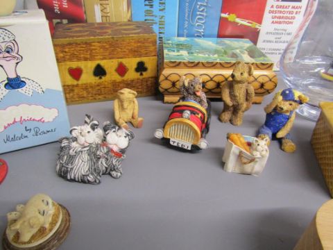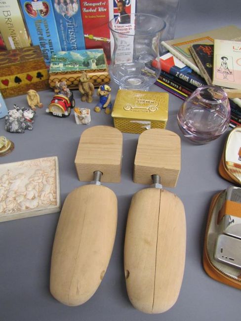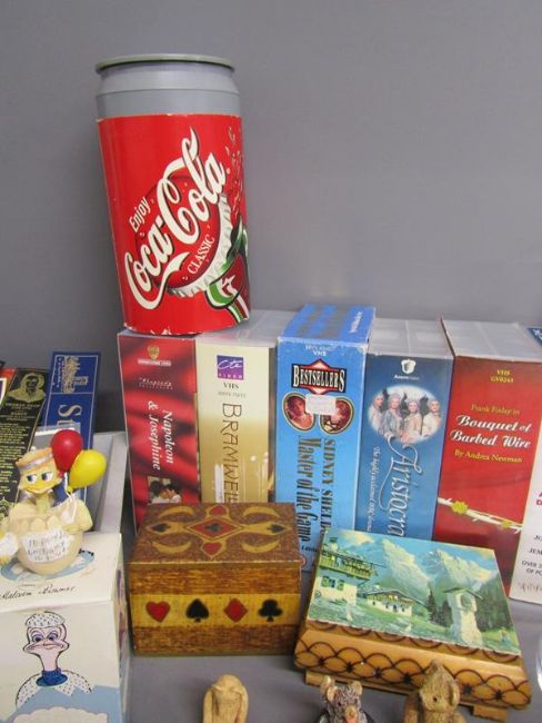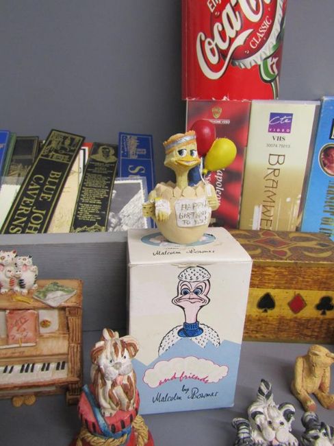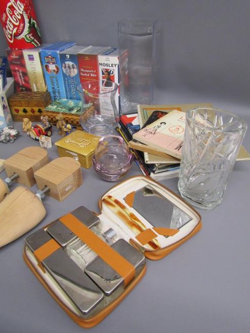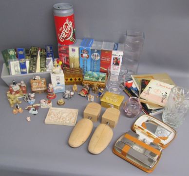 Colourbox figures, leather book marks, vases, Coca-Cola money box, videos, books, gents travel case with contents etc