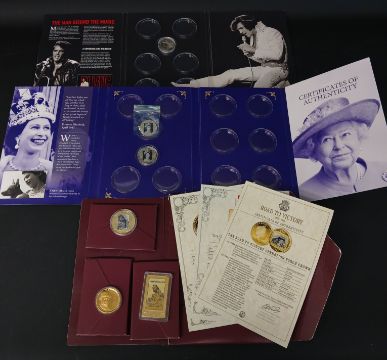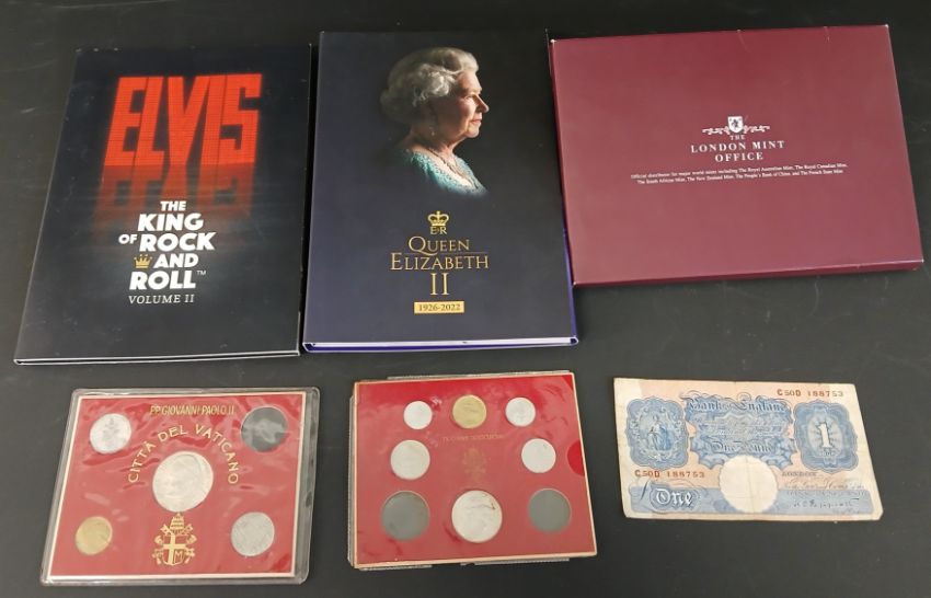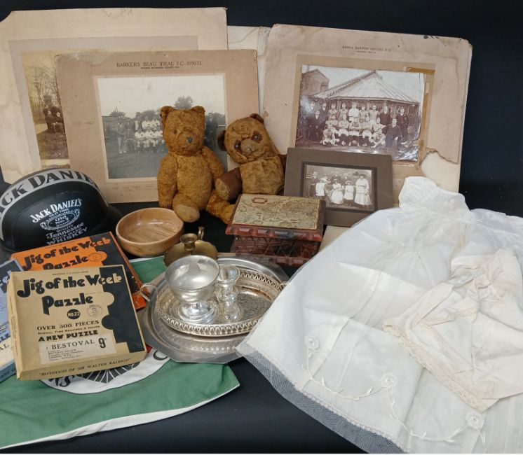Jack Daniels helmet, selection of black & white photographs including Barker's Beau Ideal Football Club 1930-31, Earls Barton Rovers Football Club 1907-8, 2 vintage teddy bears, 4 x Jig of the Week boxed puzzles, brass chamberstick, "A-Peel" christening dress and a selection of coins including gold plated commemorative crowns (part sets) & £1 bank note