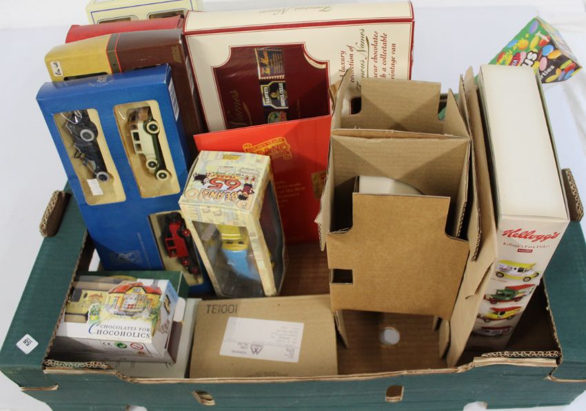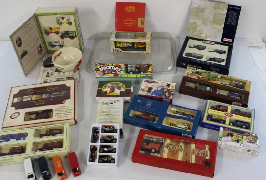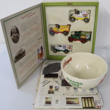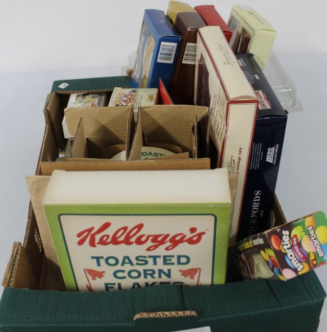 Selection of presentation/ collection packs of diecast cars, including 65yrs Beano, Kellogg's Cornflakes with bowl and cardboard model village (confectionery included in packs out of date)