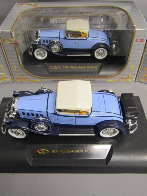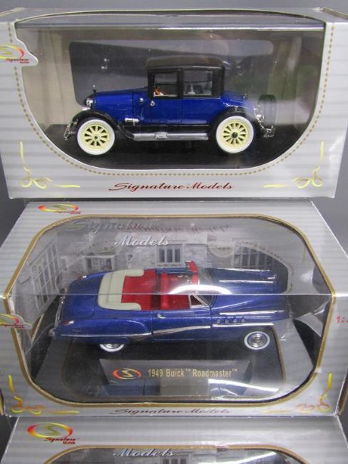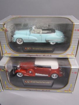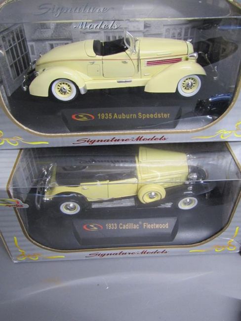 7 Signature model cars - 1935 Auburn Speedster - 1933 Cadillac Fleetwood - 1930 Pierce-Arrow Model B plus one unboxed - 1918 Cadillac type 57 Victoria Coupe - 1949 Buick Roadmaster - 1947 Cadillac Series 62 Convertible - 1933 Cadillac Fleetwood Series Phaeton Convertible V-16
