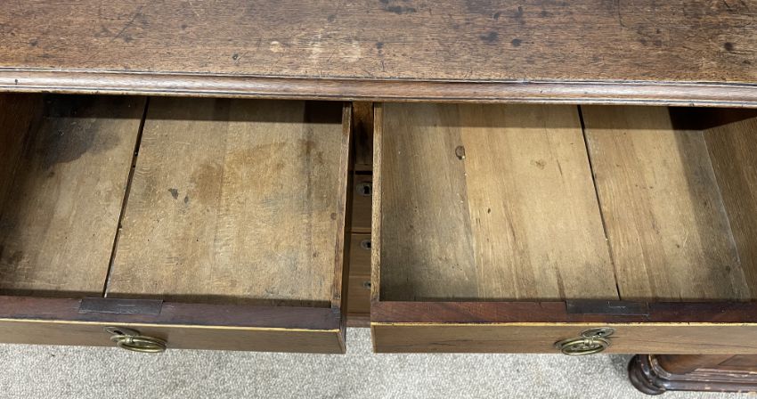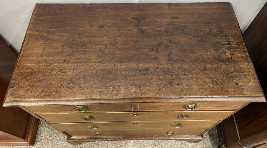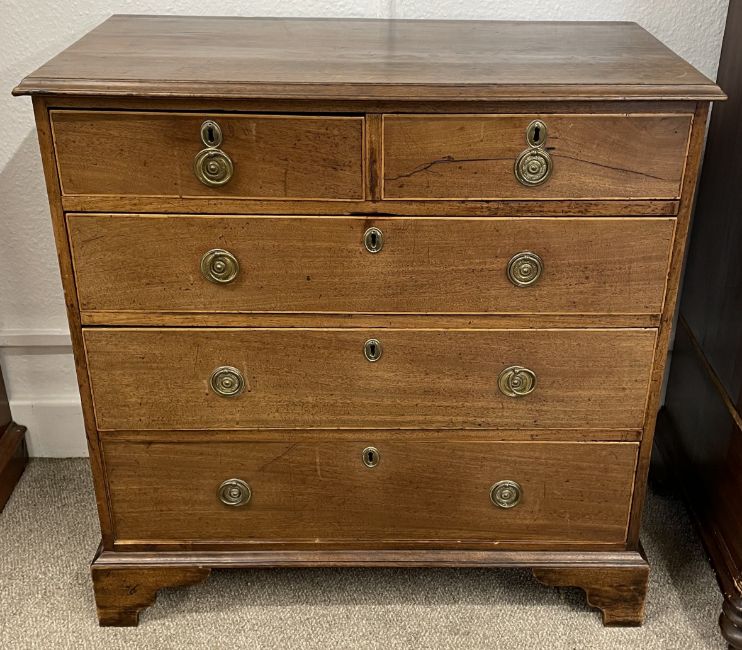 Georgian mahogany chest of drawers on bracket feet with ring handles & box wood stringing to the drawers Ht 91cm D 47cm W 90cm