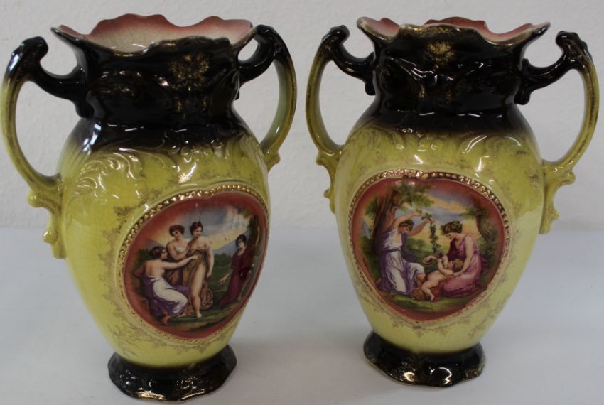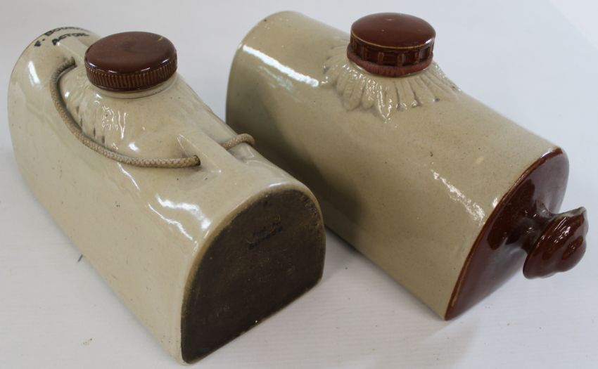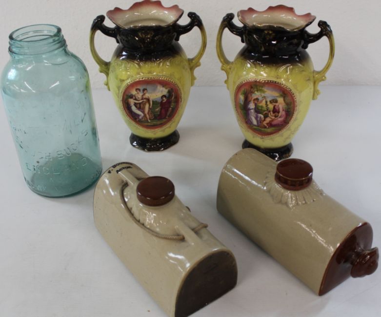 Large Horlicks jar, 2 stoneware hot water bottles & pair of Victorian vases