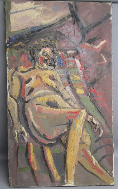 Nicholas Volley 1950 - 2006 British, oil on canvas of a female nude - approx. 134cm x 76cm - Provenance - purchased from the artist circa 1969 by a fellow student at Grimsby College - this one appears to be unsigned but was purchased with the still life that does have his name to the reverse of the painting (LOT 491)