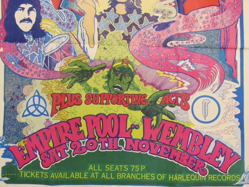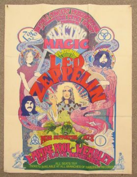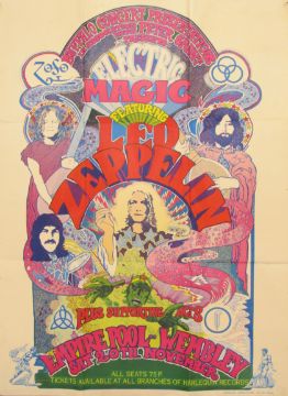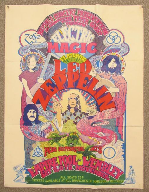 Led Zeppelin ticket poster  - Buffalo Concert Presentations presents Electric Magic featuring Led Zeppelin plus supporting acts - Empire Pool, Wembley - Saturday 20th November (1971) - all seats 75p tickets available at all branches of Harlequin records - graphics paper tiger 051 709 3549 - promotional poster sent out with the purchase of tickets to the concert - approx. 100cm x 76cm