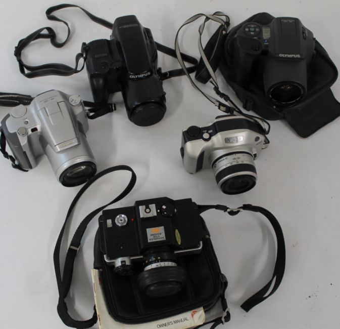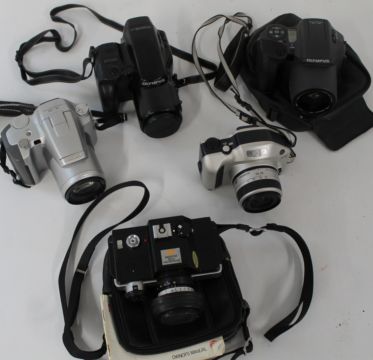 Selection of "All in One" 35mm cameras to include Olympus IS10 28-110, Olympus IS50 28-120, Olympus L1 Quartzdate 35-135, Nikon Pronea S, plus Minolta 110 Zoom SLR. Some with cases all non tested.