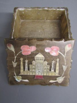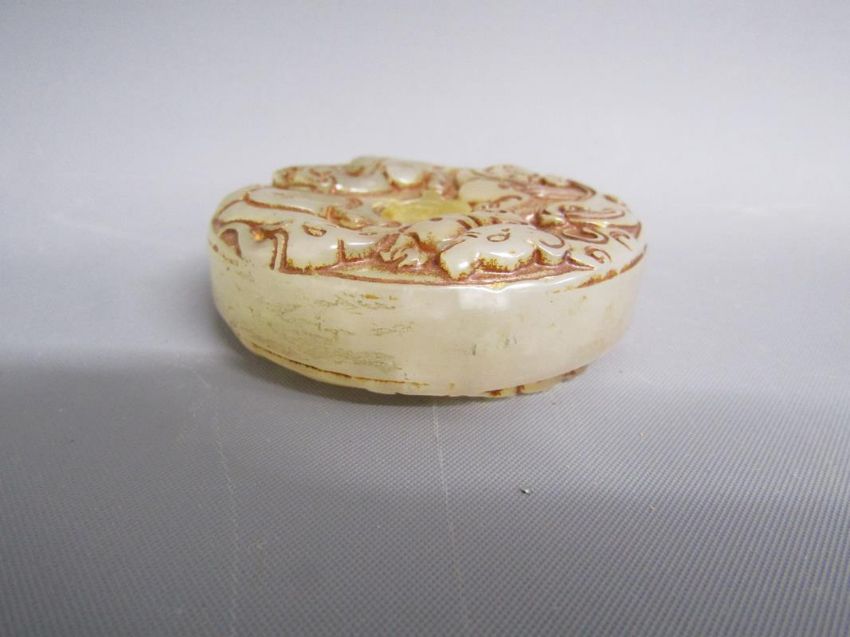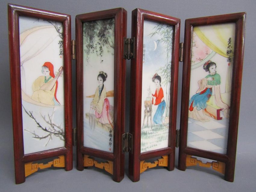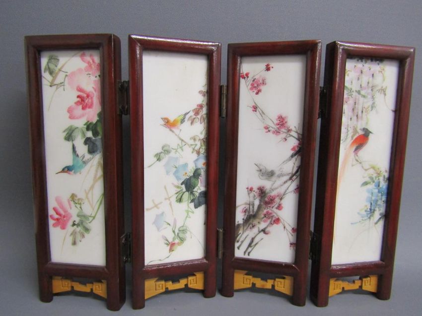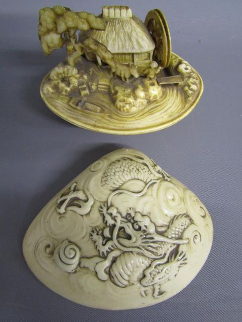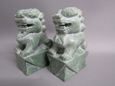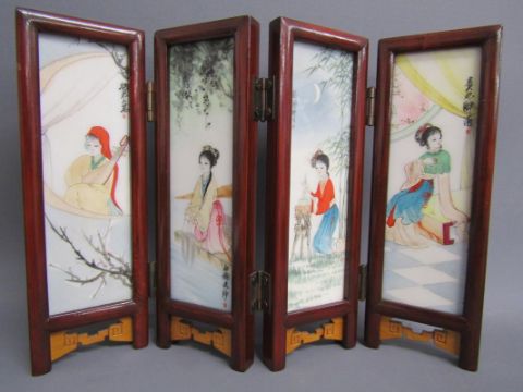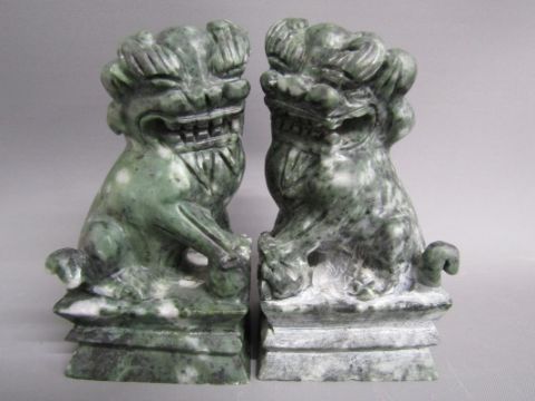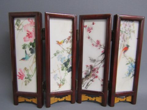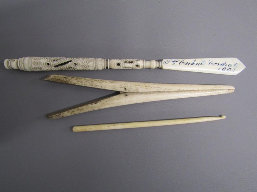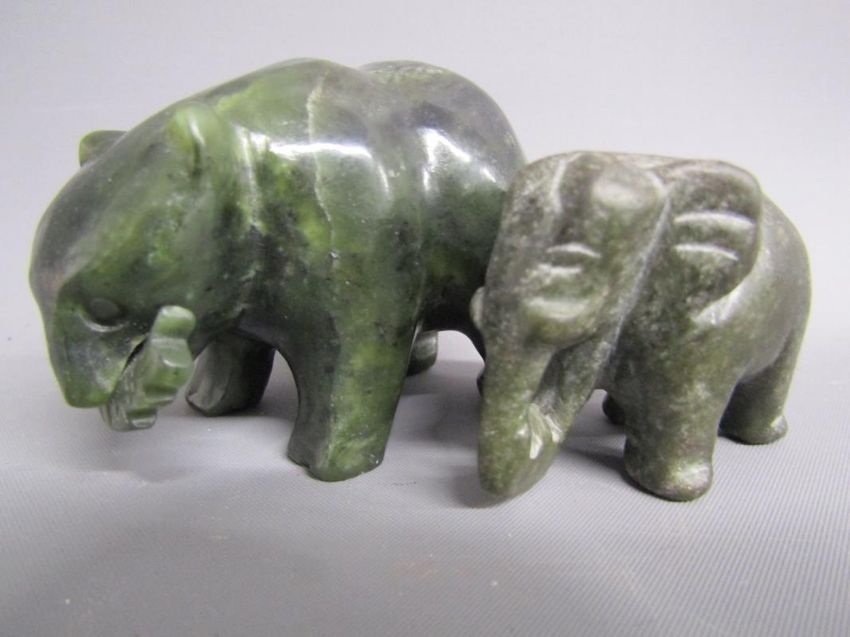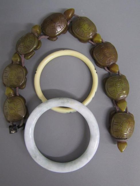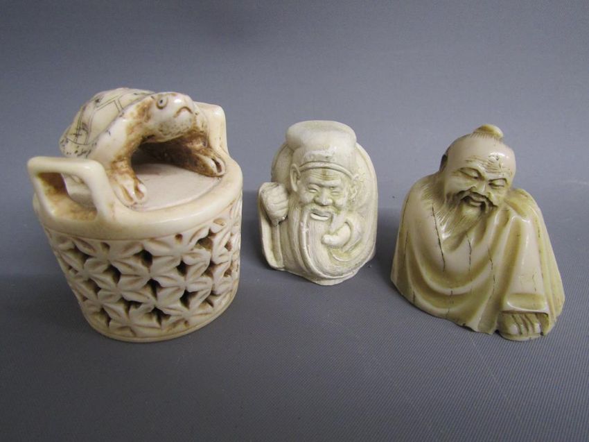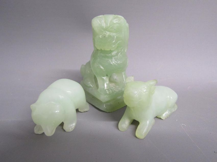 Chinese table screen with painted ladies and birds on reverse, soap stone dogs of foo, jade pig, bear, dog of foo and disc, bangles, stone bears, soap stone trinket dish, bone finger stretchers, crochet hook and letter opener (Stanhope missing) and nibs with Entente Cordial 1908 to blade