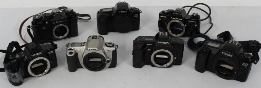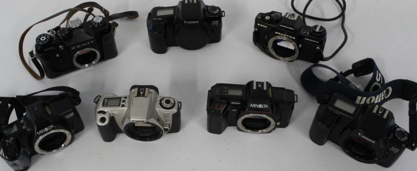 Selection of Camera bodies (only) to include Minolta Dynax 3000i, Minolta 5000, Canon EOS300, Zenit TTL, 2 of Canon EOS 1000F, Praktica B200 electronic. All untested