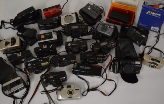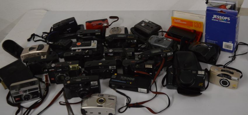 Selection of auto compact cameras, various film formats including 35mm, 110, and disc makes include Halina, Agfa Matic, Canon, Kodak, Panasonics, Samsung, Praktica etc etc. Some with cases all untested. plus a Digital Camera kit