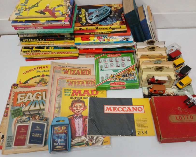 Quantity of children's vintage annuals, Subbuteo World Cup Squad 66000 Paraguay, Meccano booklet of medels, comics including Wizard & Eagle, die cast vehicles including Spectrum Pursuit Vehicle, Matchbox & Days Gone, Happy Families cards etc.